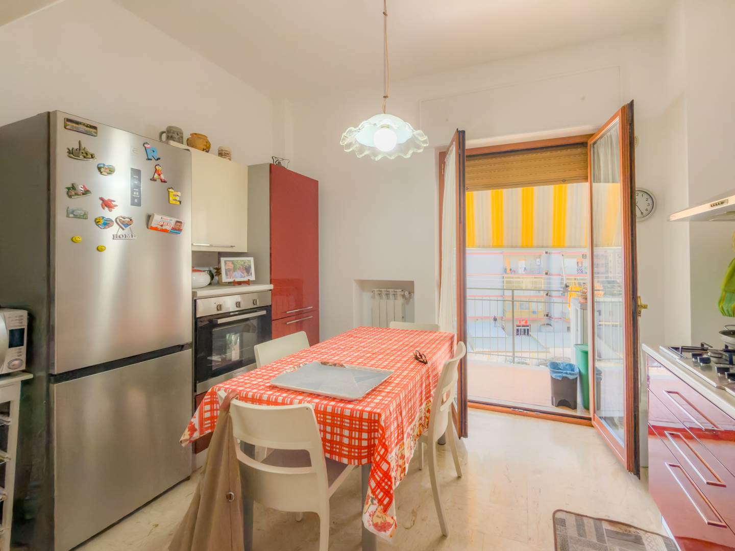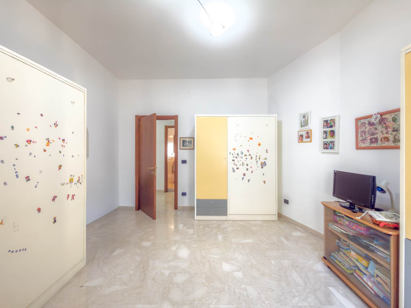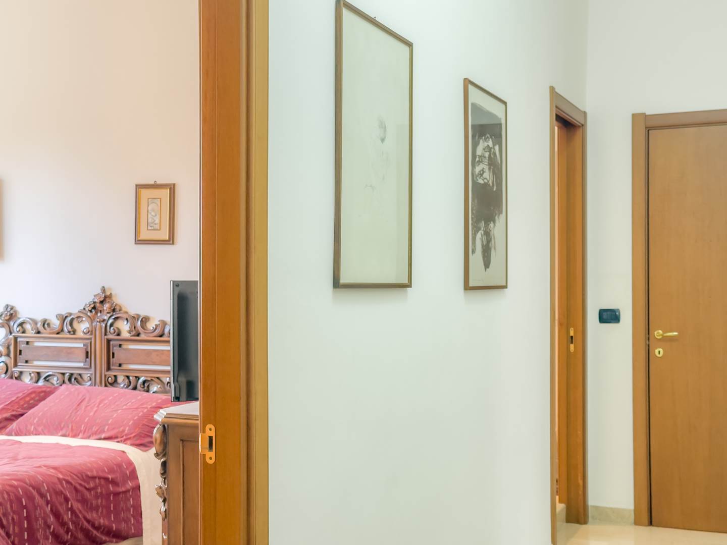 Sul lato interno dell’abitazione si sviluppa una cucina ampia e completamente attrezzata, dotata di elettrodomestici e di corredo completo di piatti, bicchieri, posate e pentole, con accesso a un secondo balcone affacciato sul cortile condominiale. Completano la distribuzione una comoda camera studio con divano, televisione e tavolo, facilmente trasformabile in terza camera da letto, e una spaziosa camera matrimoniale arredata con mobili di pregio.