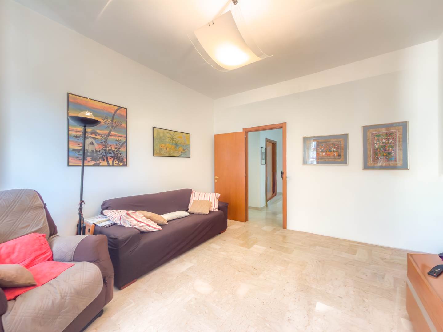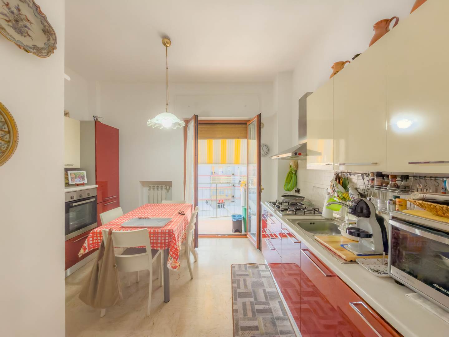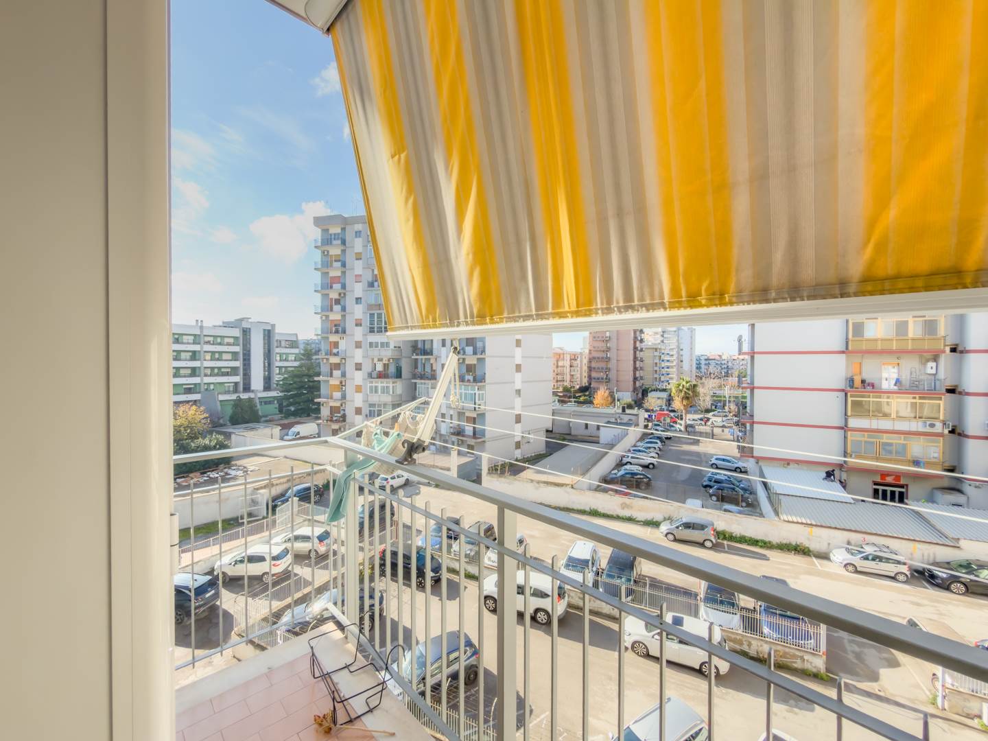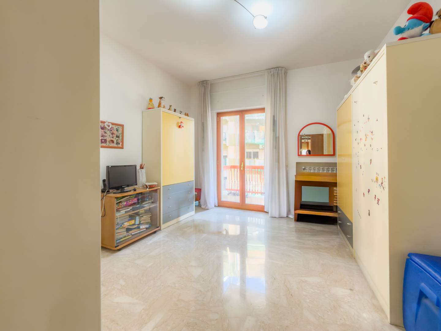 Sul lato interno dell’abitazione si sviluppa una cucina ampia e completamente attrezzata, dotata di elettrodomestici e di corredo completo di piatti, bicchieri, posate e pentole, con accesso a un secondo balcone affacciato sul cortile condominiale. Completano la distribuzione una comoda camera studio con divano, televisione e tavolo, facilmente trasformabile in terza camera da letto, e una spaziosa camera matrimoniale arredata con mobili di pregio.