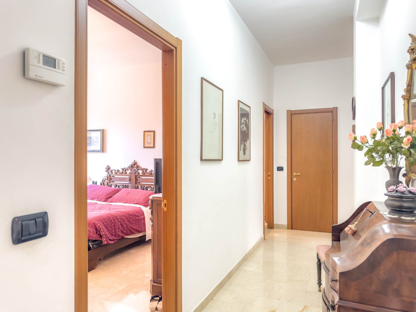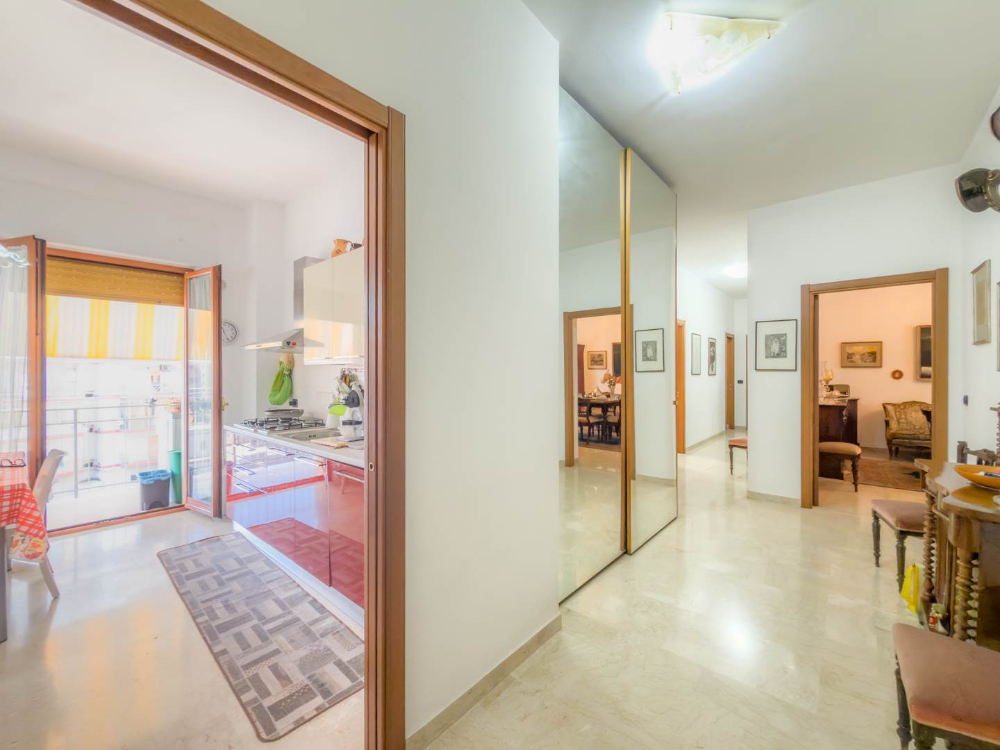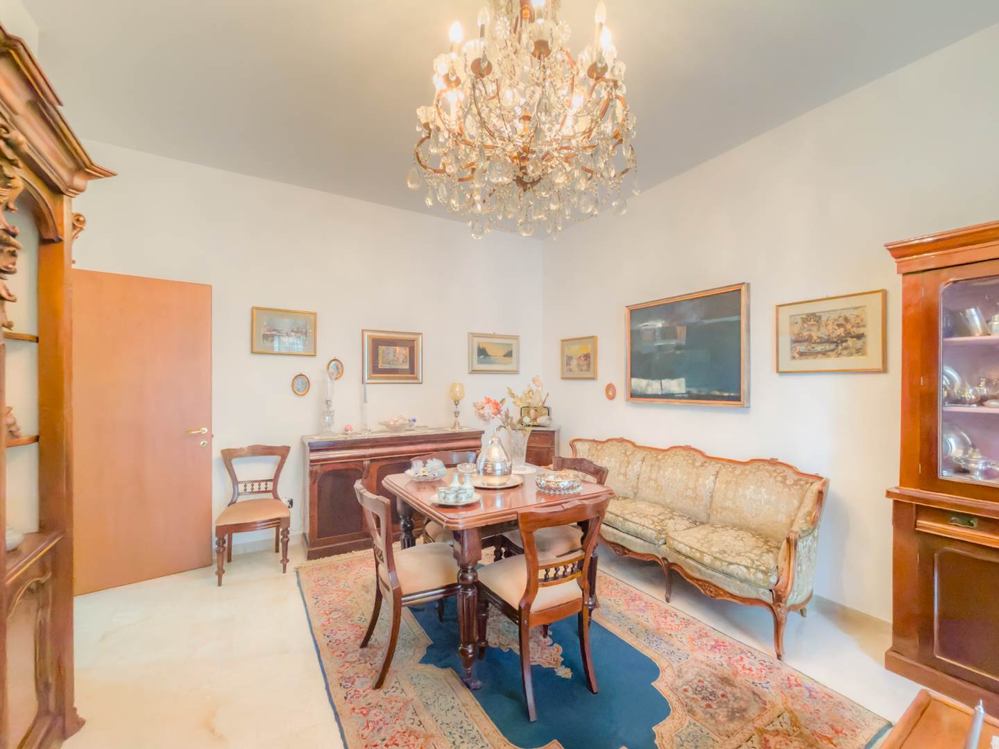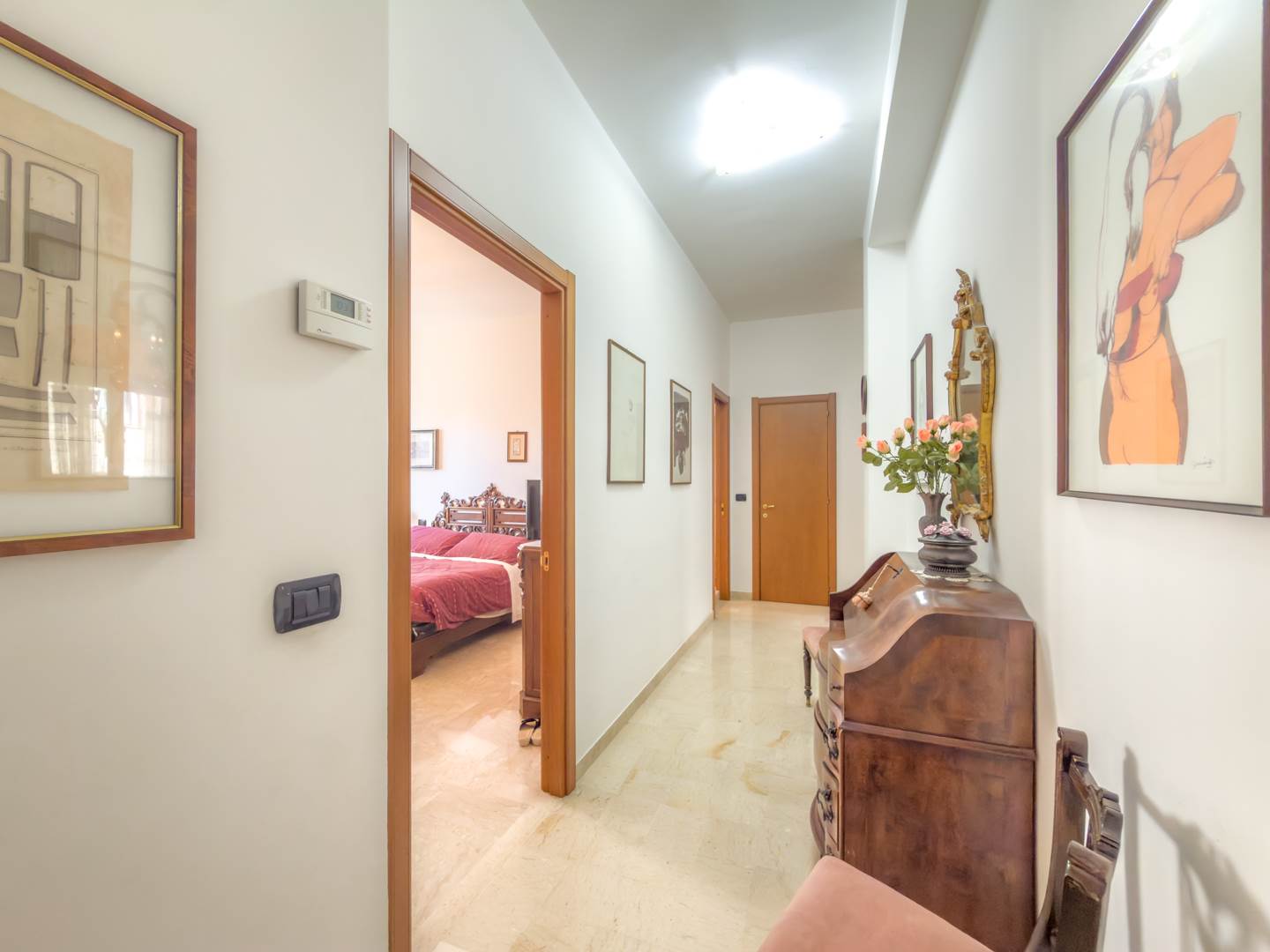 L’appartamento, completamente restaurato e in ottime condizioni, si apre su un ampio ingresso che conduce a un elegante salone arredato con mobili di pregio, affacciato su un balcone con vista su Via Emilia. La zona notte sullo stesso affaccio comprende una camera da letto con due letti a scomparsa, anch’essa servita da balcone.