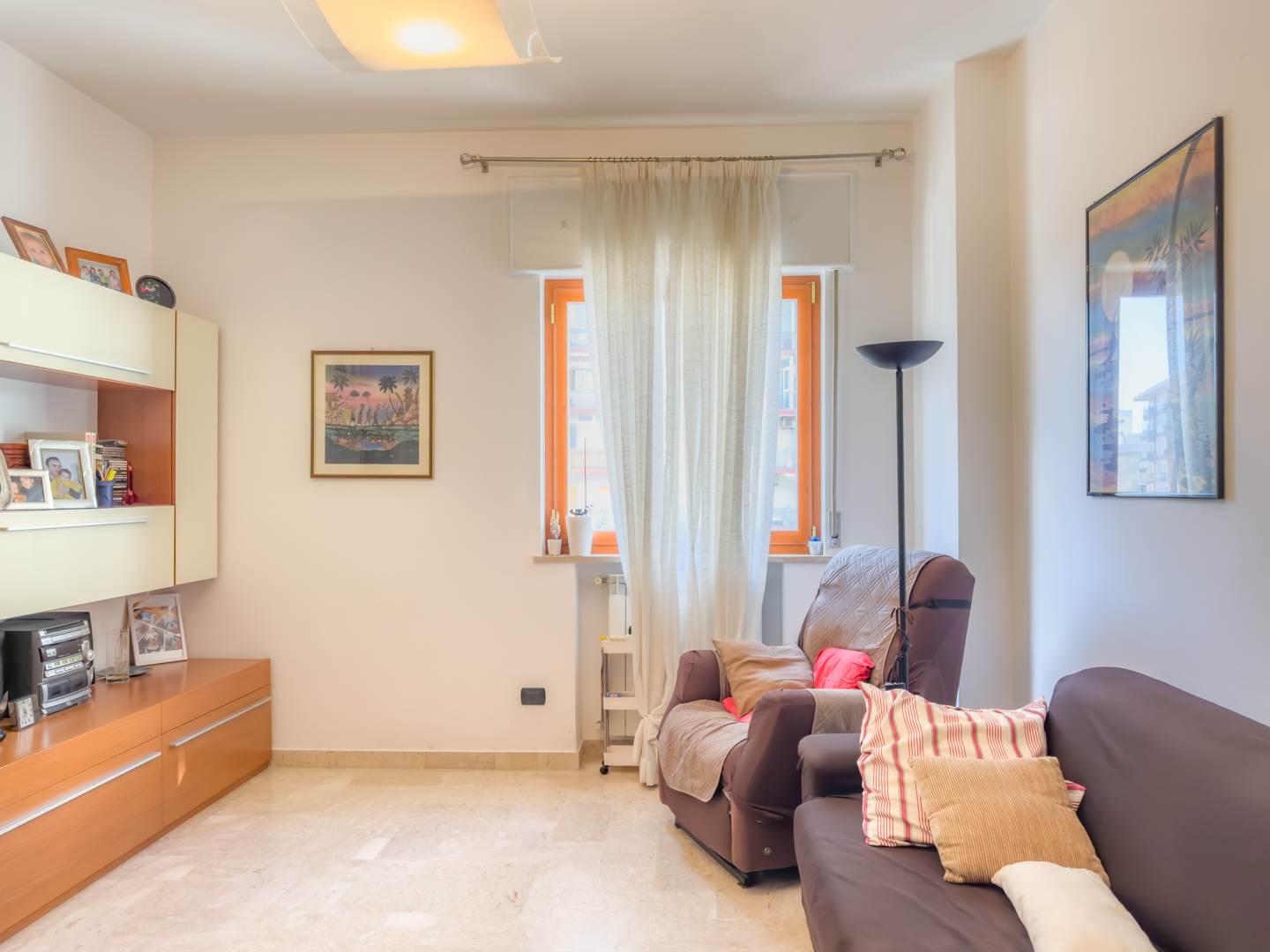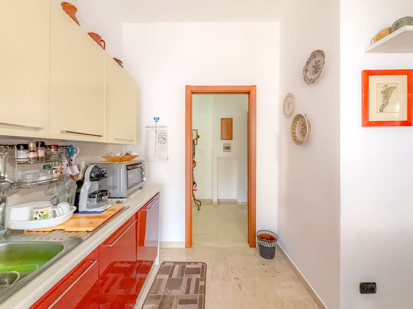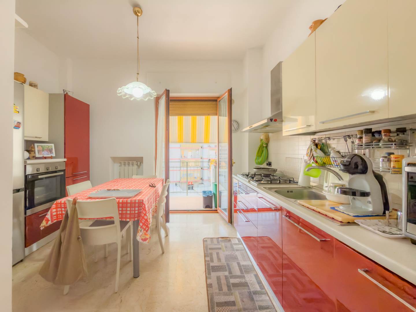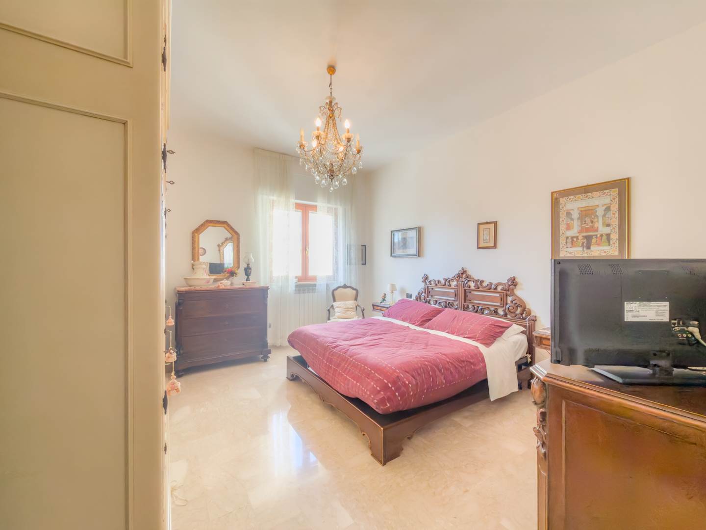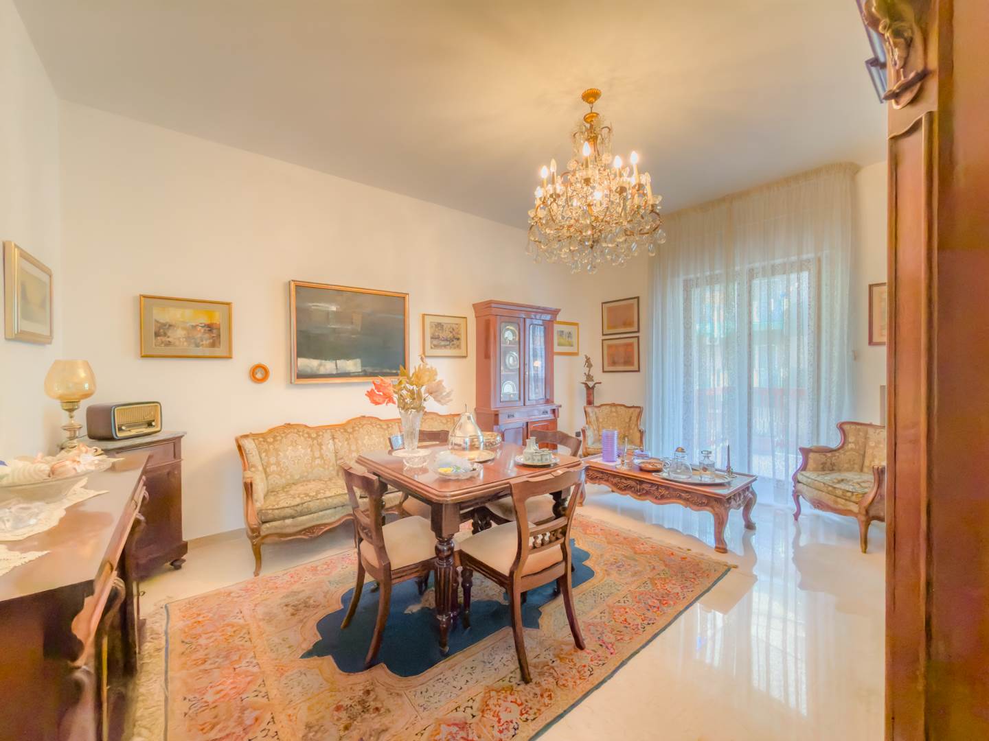 L’appartamento, completamente restaurato e in ottime condizioni, si apre su un ampio ingresso che conduce a un elegante salone arredato con mobili di pregio, affacciato su un balcone con vista su Via Emilia. La zona notte sullo stesso affaccio comprende una camera da letto con due letti a scomparsa, anch’essa servita da balcone.