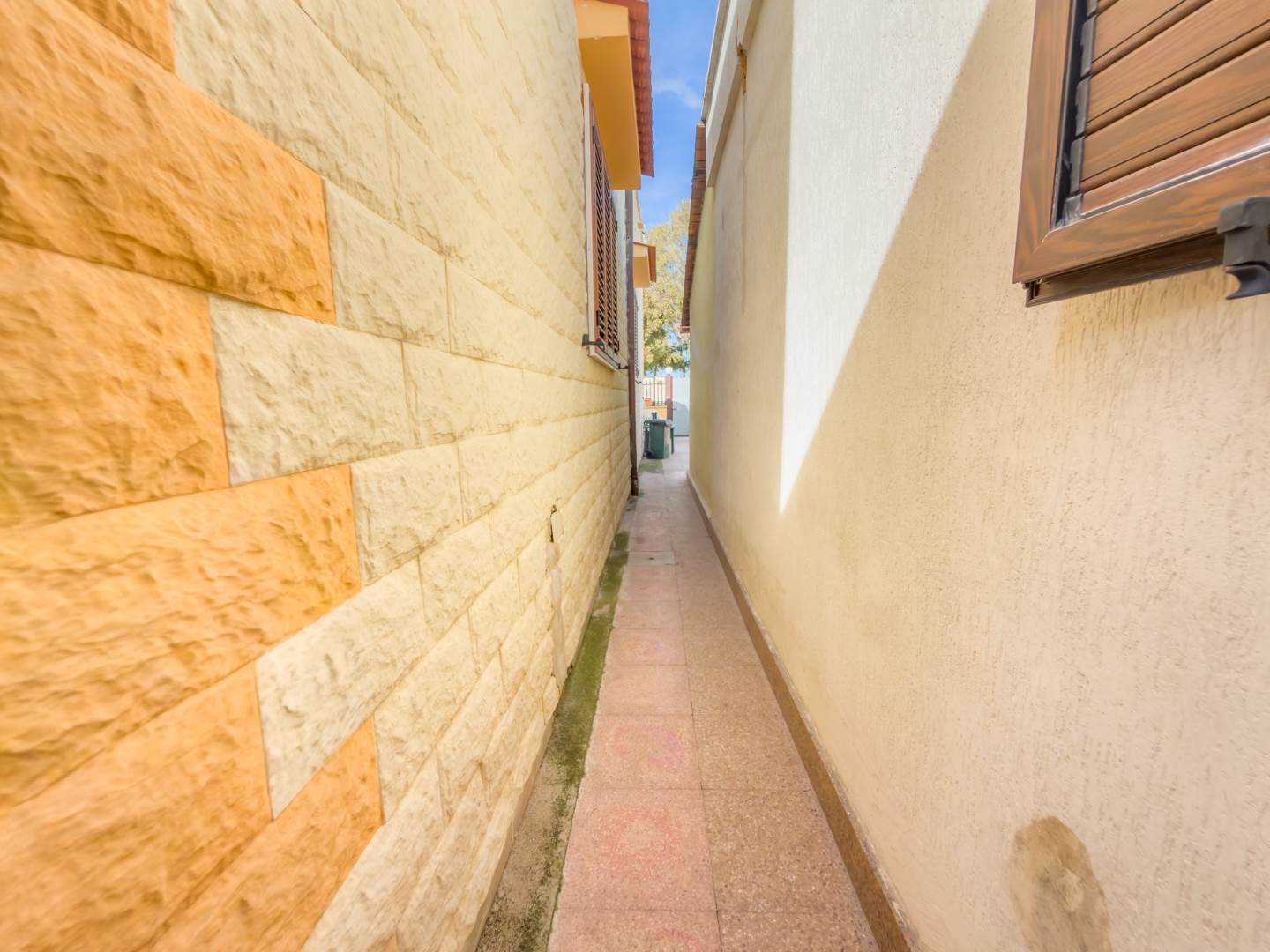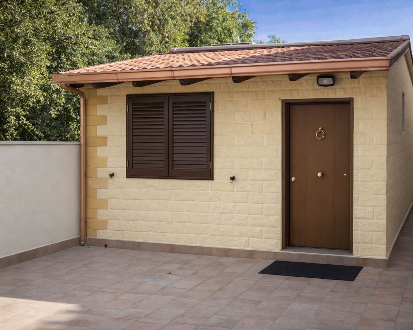 Superato il cancello si accede ad un’ampia area esterna vivibile con giardino mattonato, uno spazio riservato che accompagna all’ingresso principale e valorizza l’indipendenza dell’immobile.