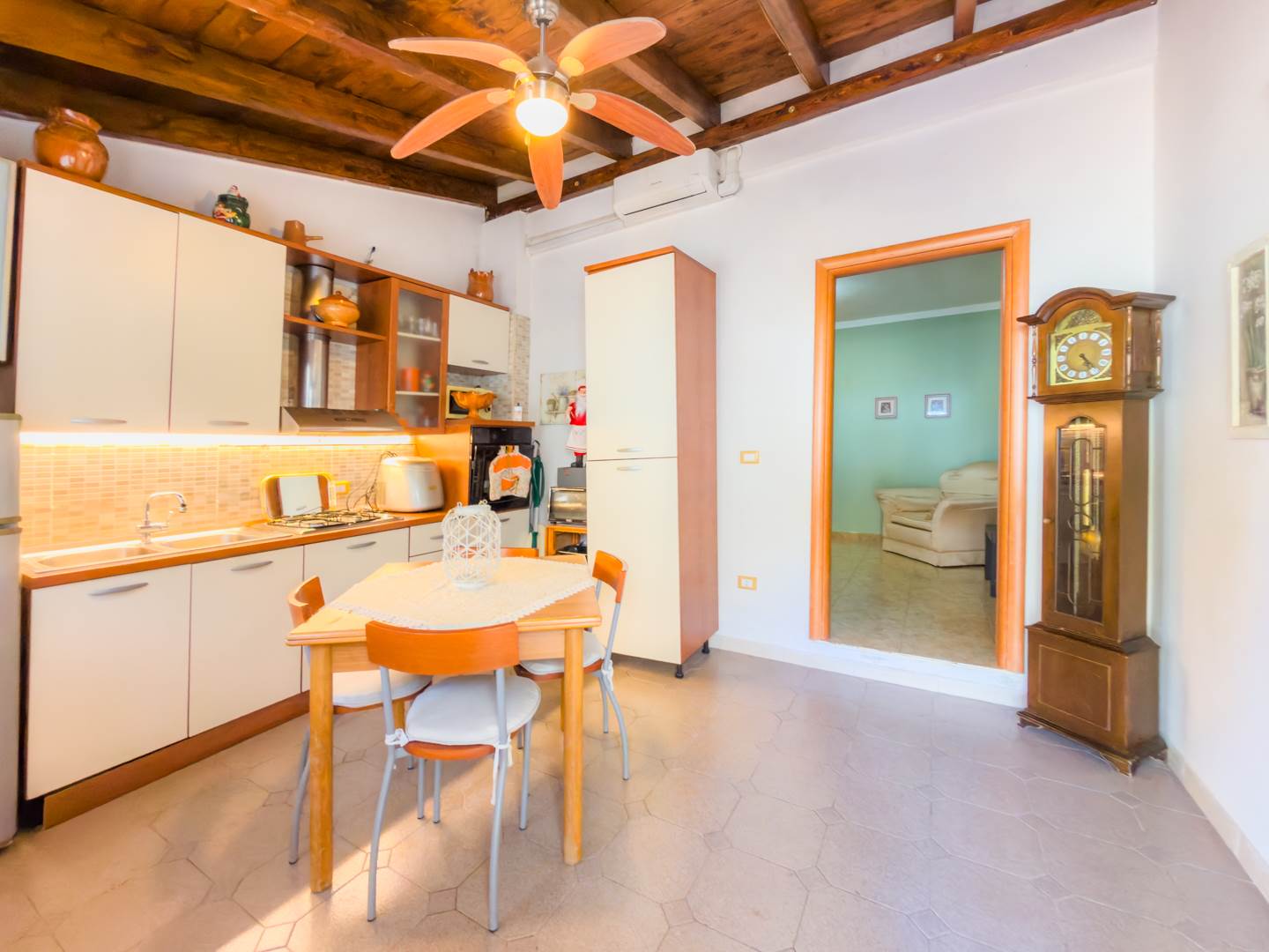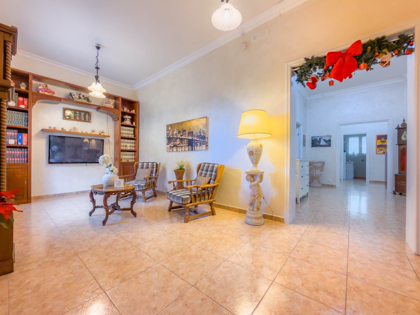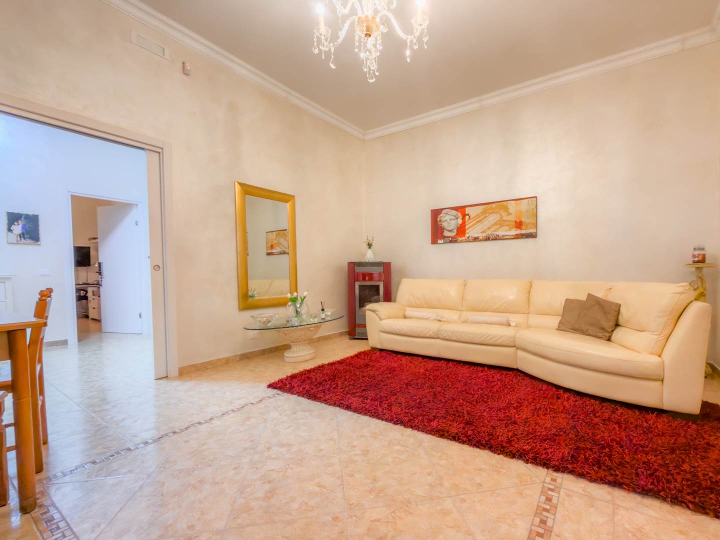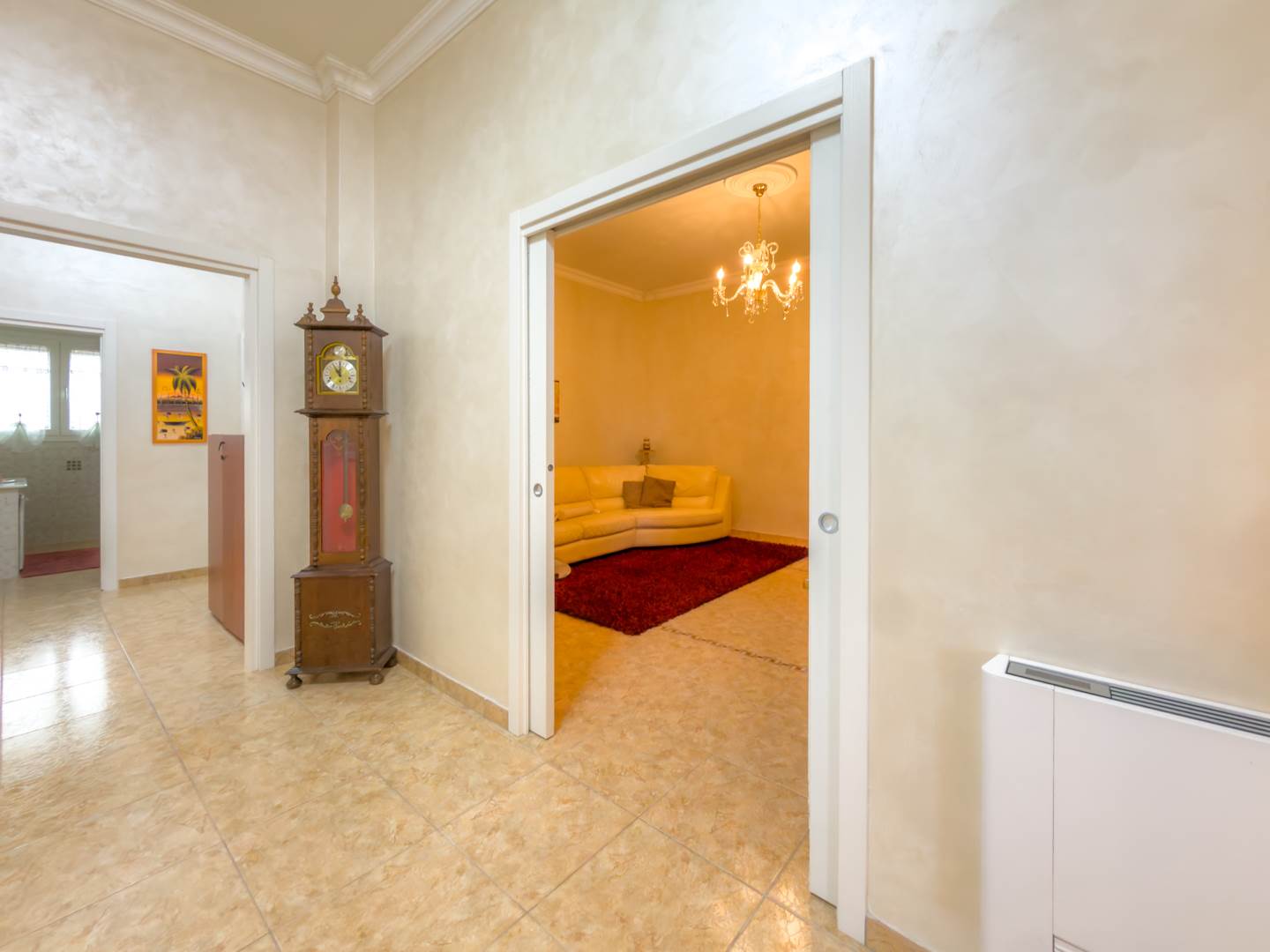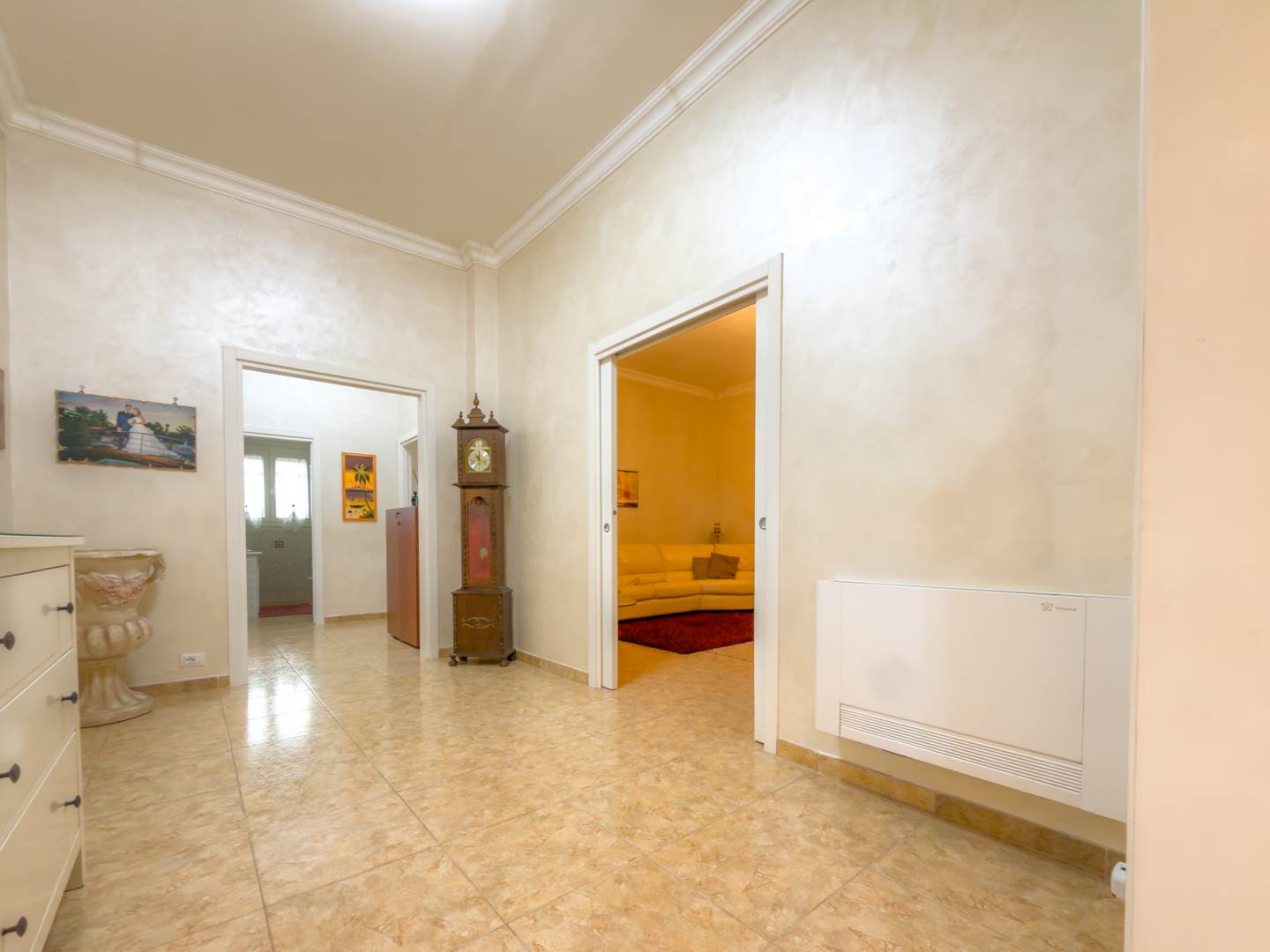 La porta blindata introduce in un ampio ambiente di accoglienza che si apre su una prima zona soggiorno luminosa e ben proporzionata. Sulla destra si sviluppa la cucina abitabile, separata e funzionale per la vita quotidiana, dotata di finestra con affaccio sull’area laterale di collegamento con accesso al terrazzo, uno spazio esterno di servizio che consente un comodo collegamento alla parte retrostante dell’abitazione e alle scale che conducono al lastrico solare.