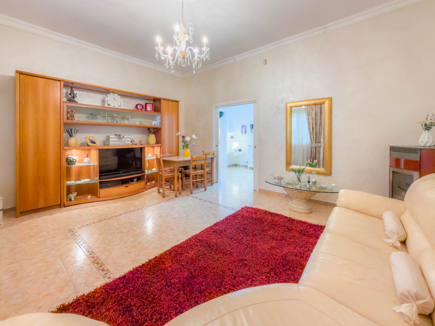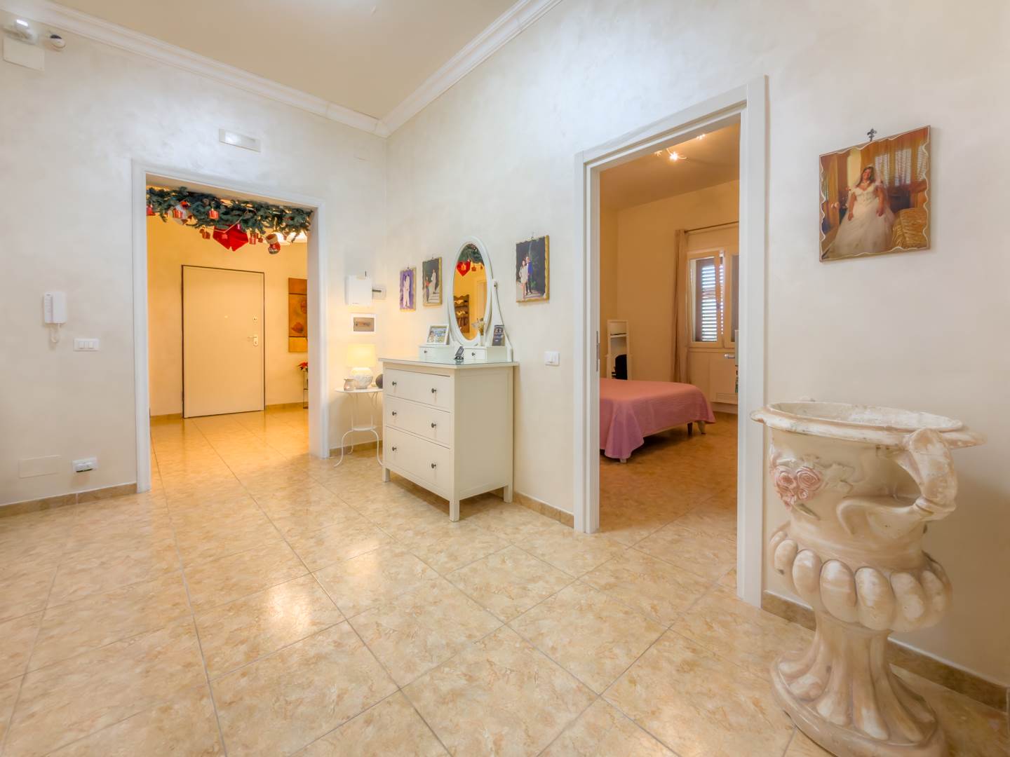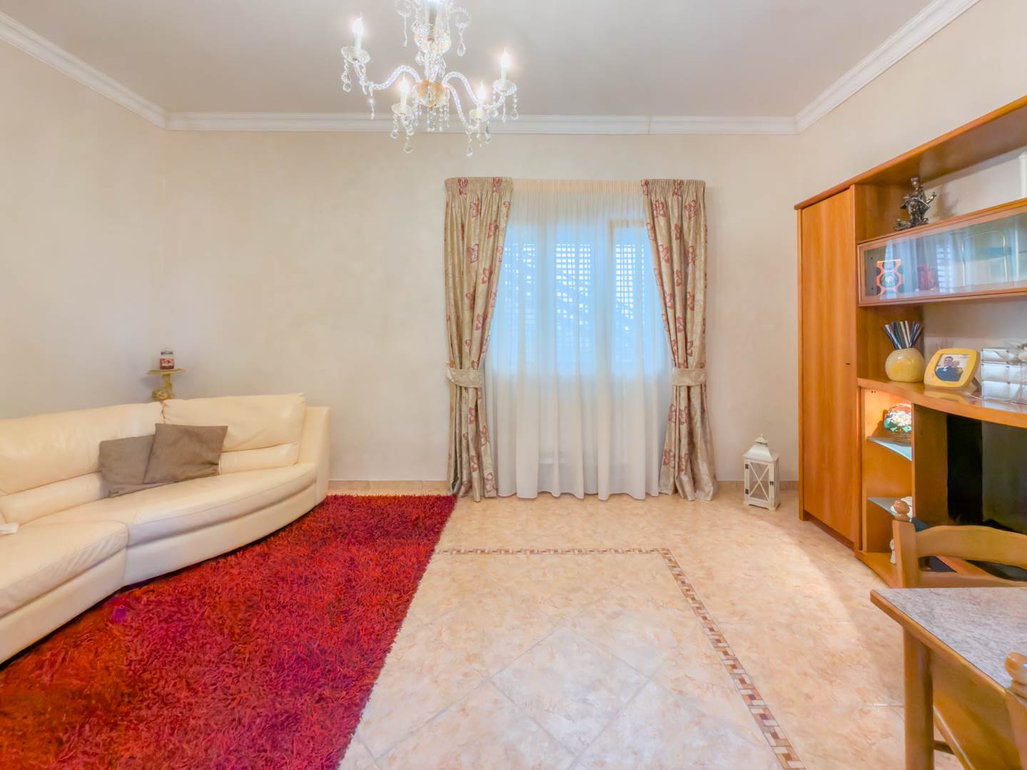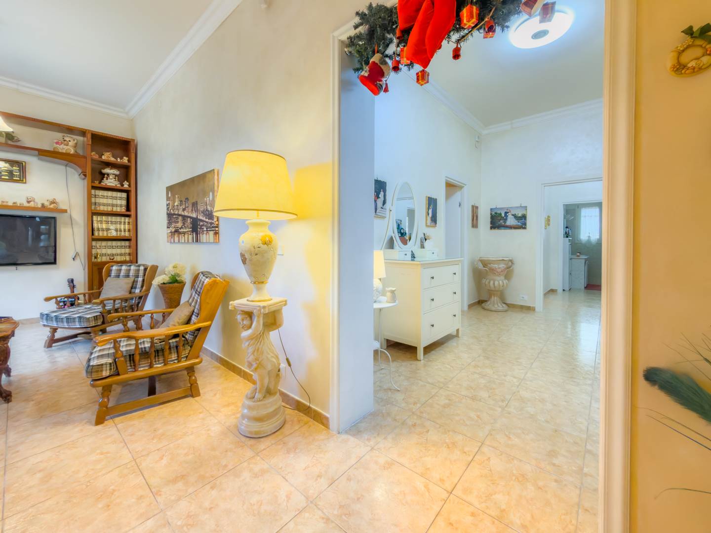 La porta blindata introduce in un ampio ambiente di accoglienza che si apre su una prima zona soggiorno luminosa e ben proporzionata. Sulla destra si sviluppa la cucina abitabile, separata e funzionale per la vita quotidiana, dotata di finestra con affaccio sull’area laterale di collegamento con accesso al terrazzo, uno spazio esterno di servizio che consente un comodo collegamento alla parte retrostante dell’abitazione e alle scale che conducono al lastrico solare.