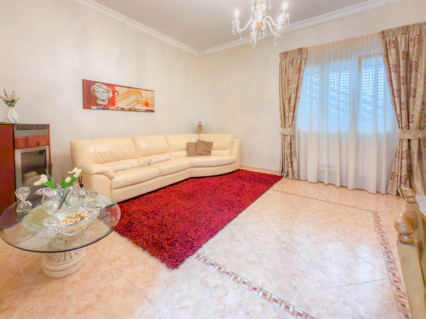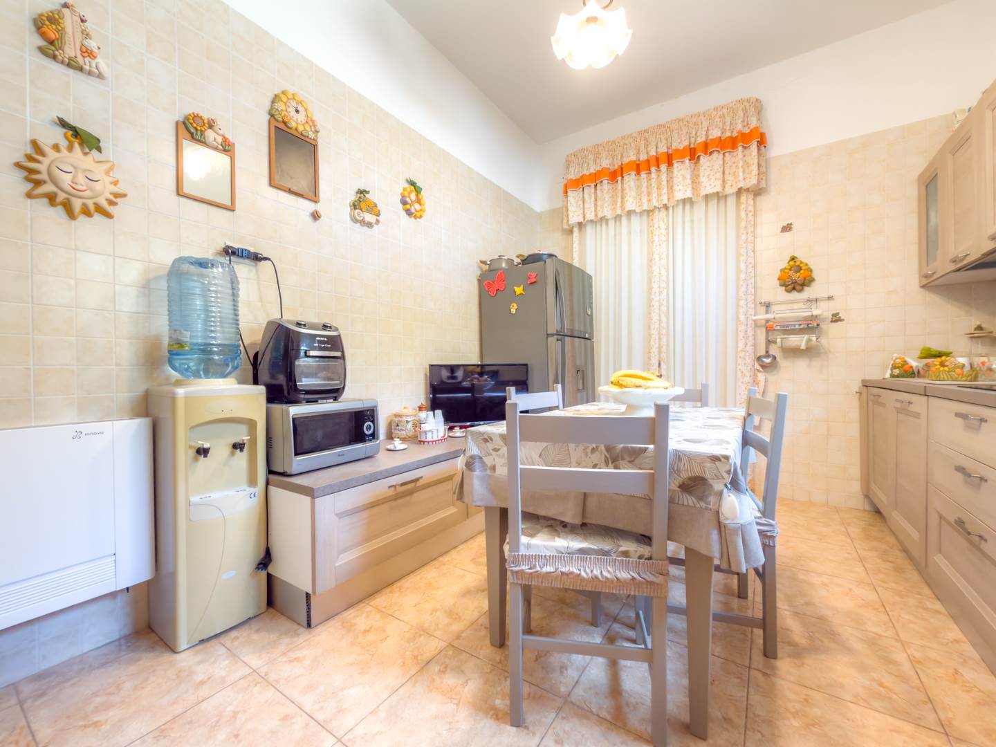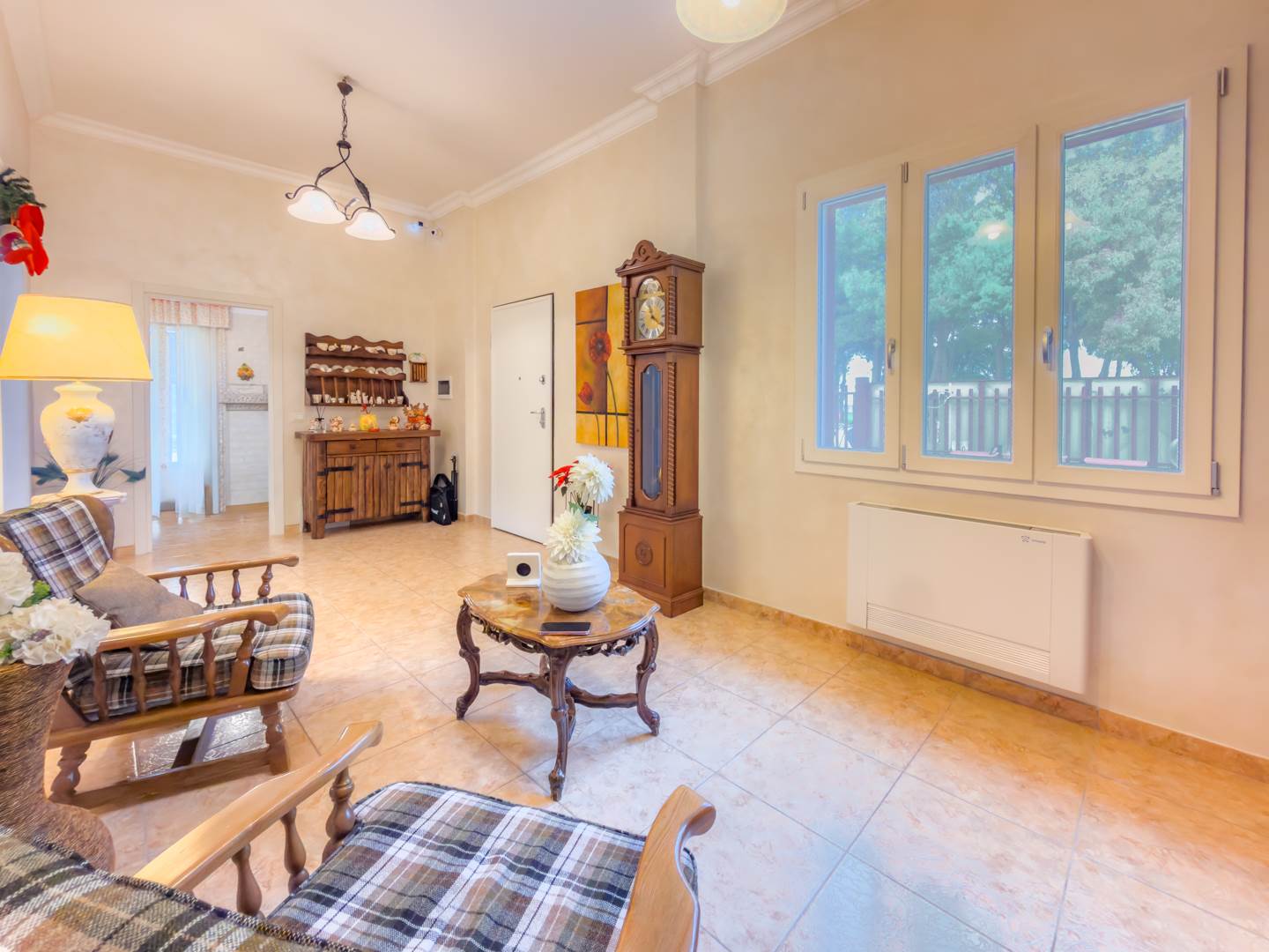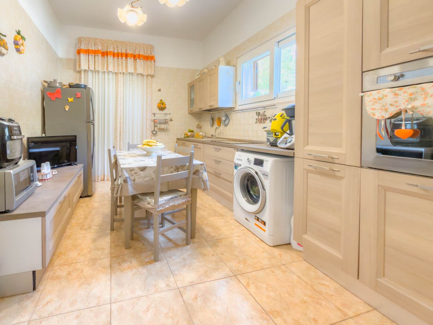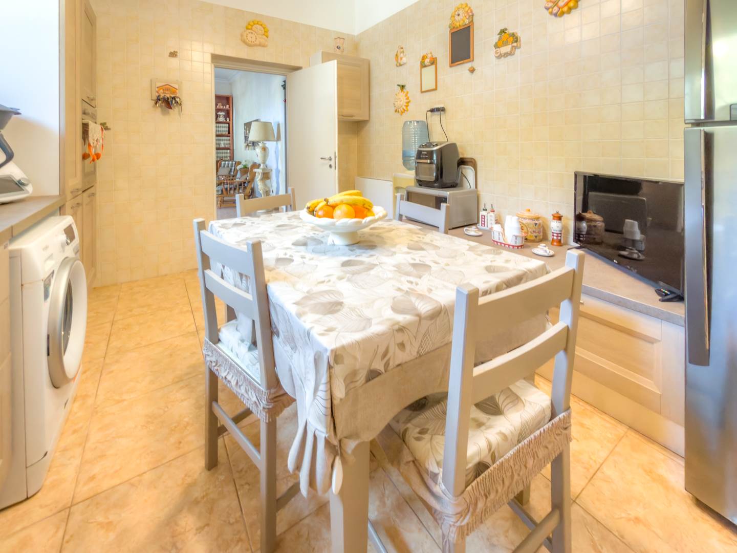 La porta blindata introduce in un ampio ambiente di accoglienza che si apre su una prima zona soggiorno luminosa e ben proporzionata. Sulla destra si sviluppa la cucina abitabile, separata e funzionale per la vita quotidiana, dotata di finestra con affaccio sull’area laterale di collegamento con accesso al terrazzo, uno spazio esterno di servizio che consente un comodo collegamento alla parte retrostante dell’abitazione e alle scale che conducono al lastrico solare.