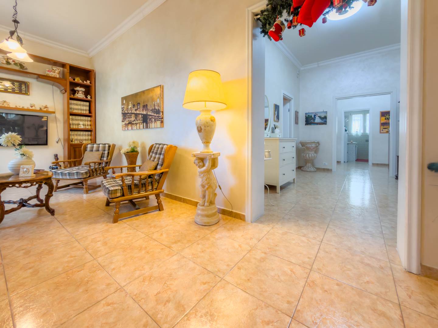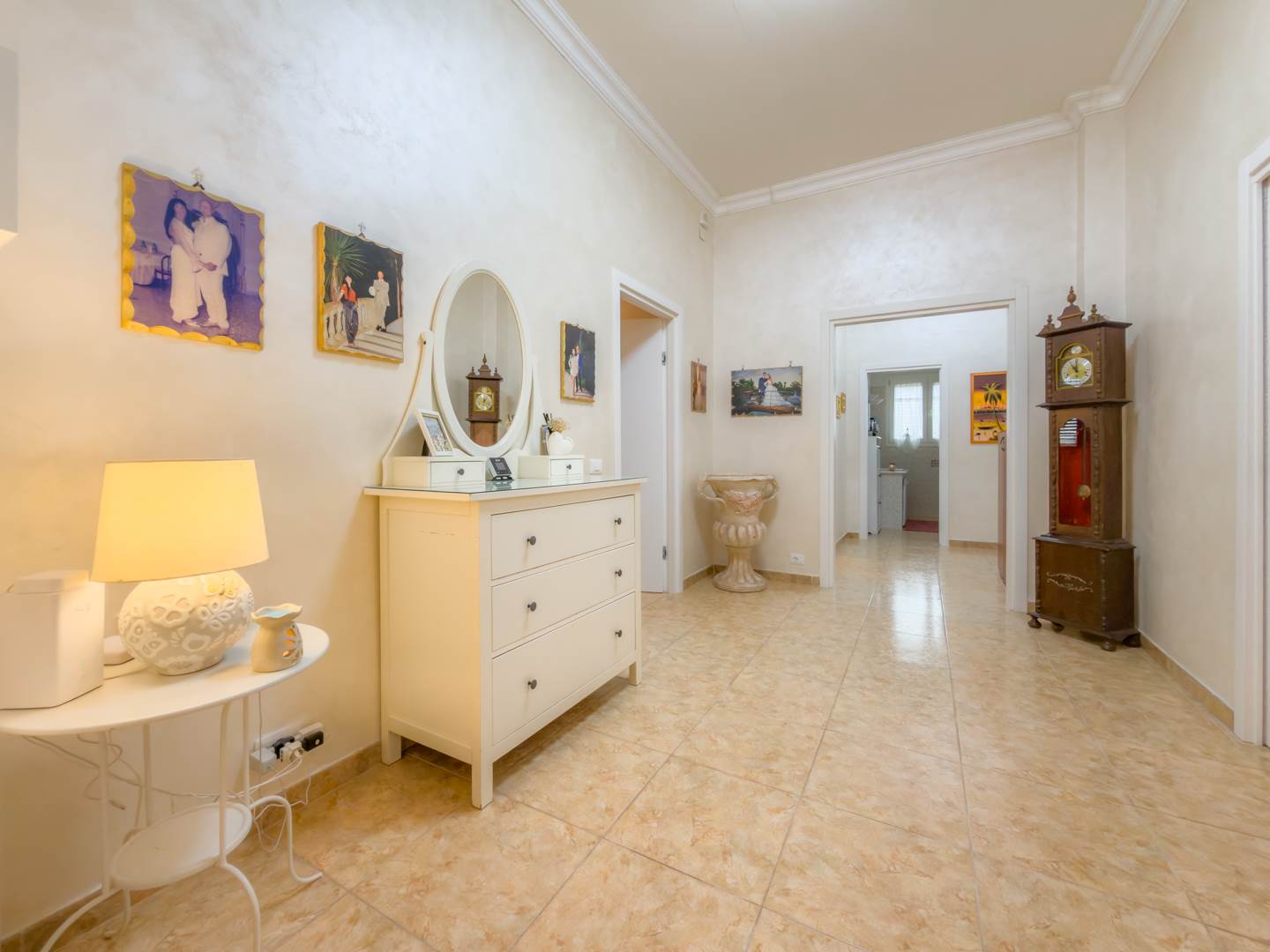 Nel primo corridoio troviamo una spaziosa camera matrimoniale e un grande soggiorno aggiuntivo, ambiente importante per dimensioni e versatilità, ideale come zona living principale, sala di rappresentanza o ulteriore spazio conviviale.