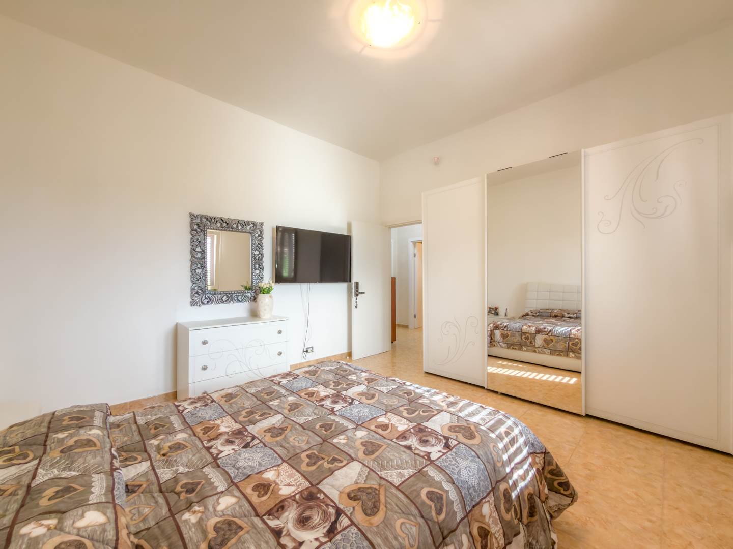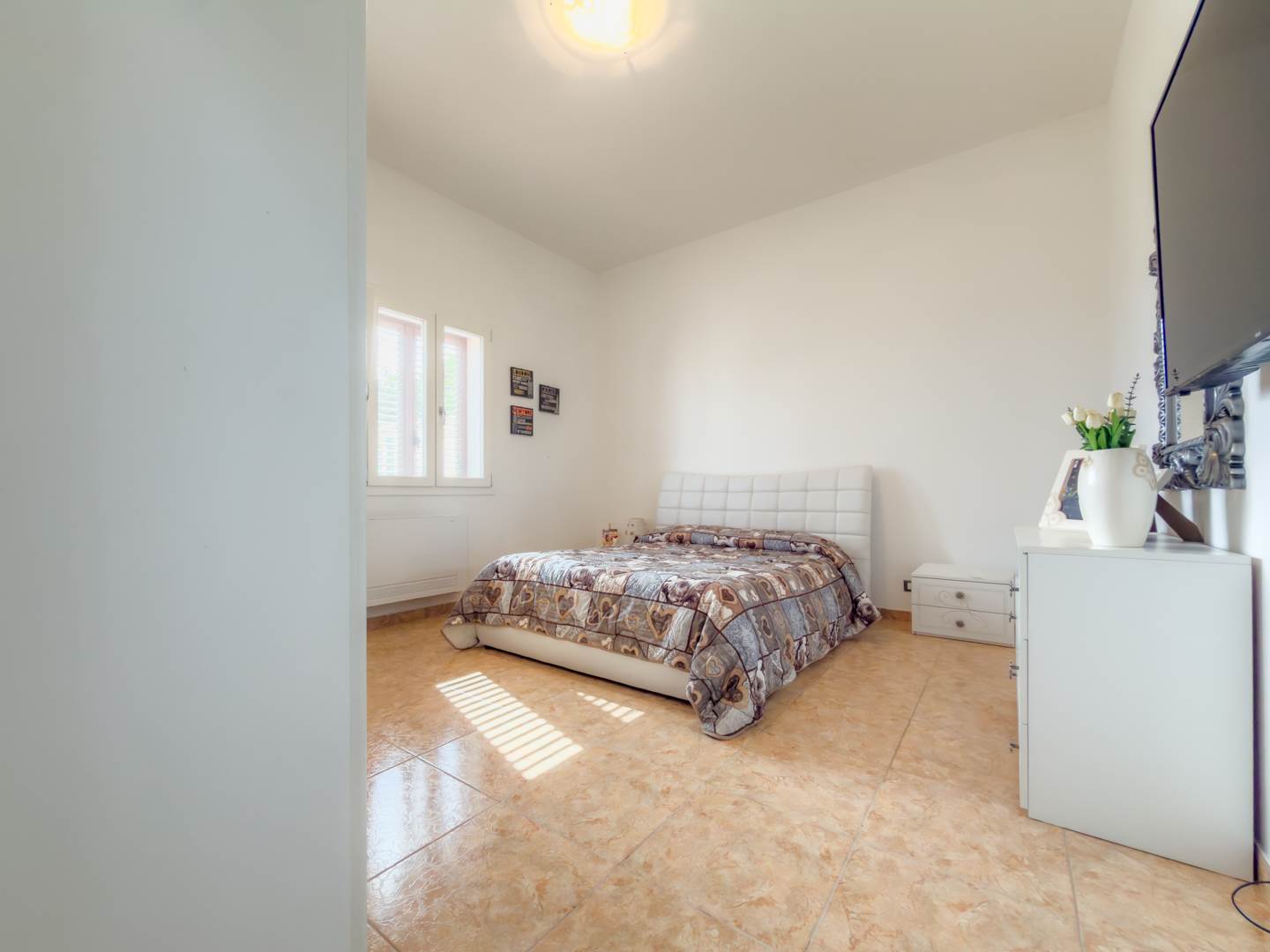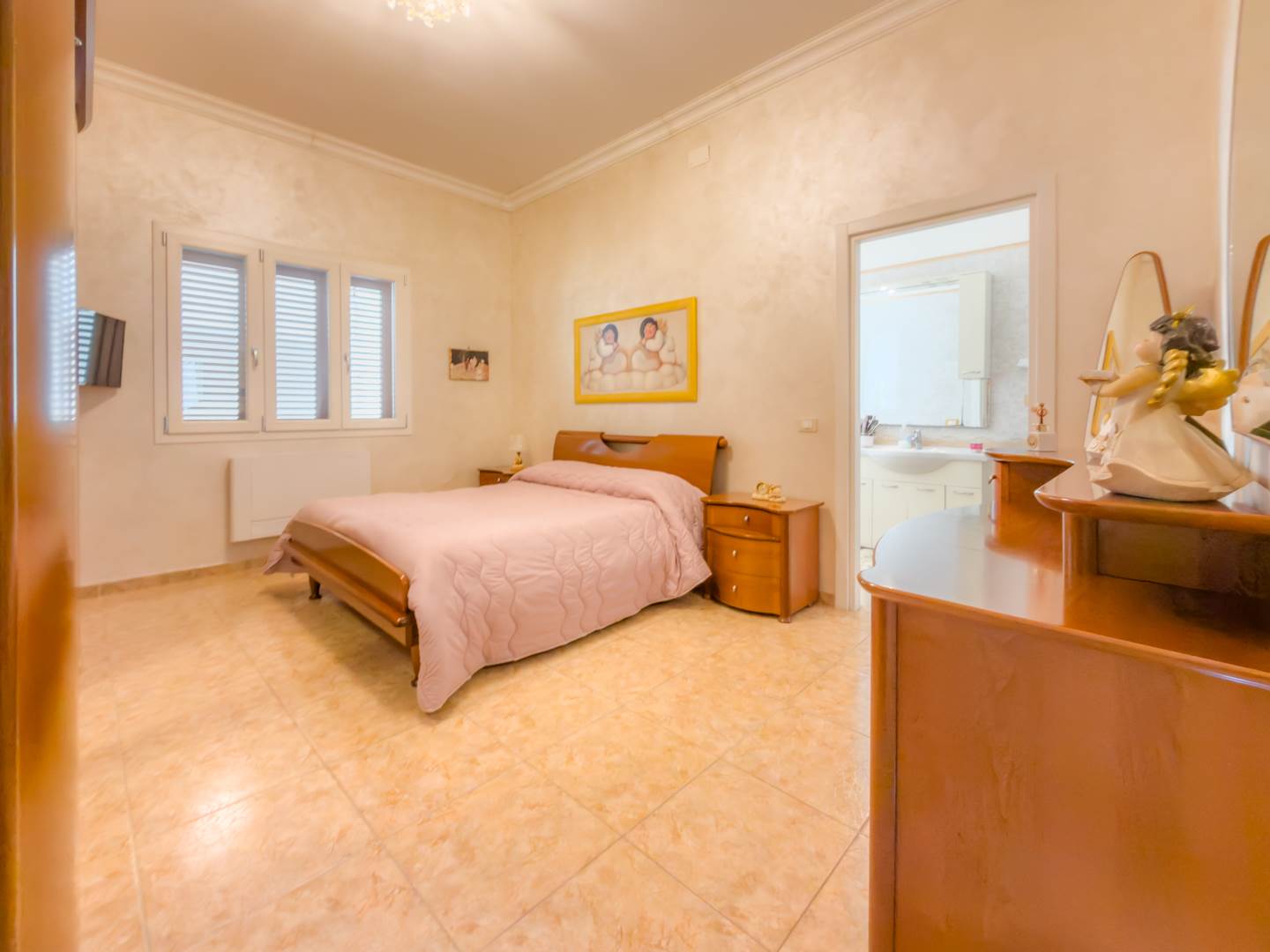 Proseguendo nella zona più riservata della casa, il secondo disimpegno conduce alla seconda camera da letto con bagno en suite dotato di vasca, soluzione che assicura comfort e autonomia. Sul lato opposto si sviluppa la terza camera, anch’essa ampia e regolare nelle dimensioni.
