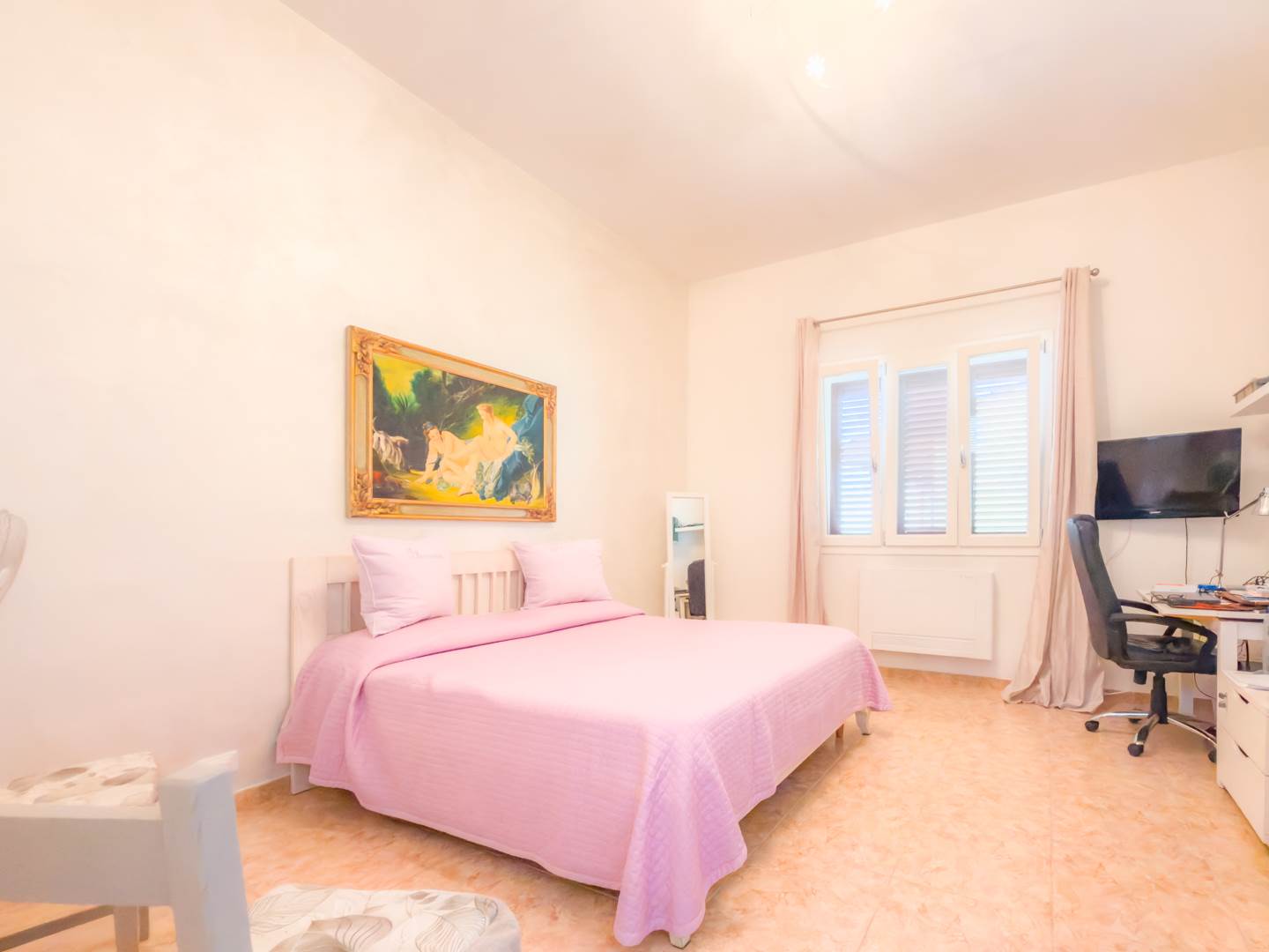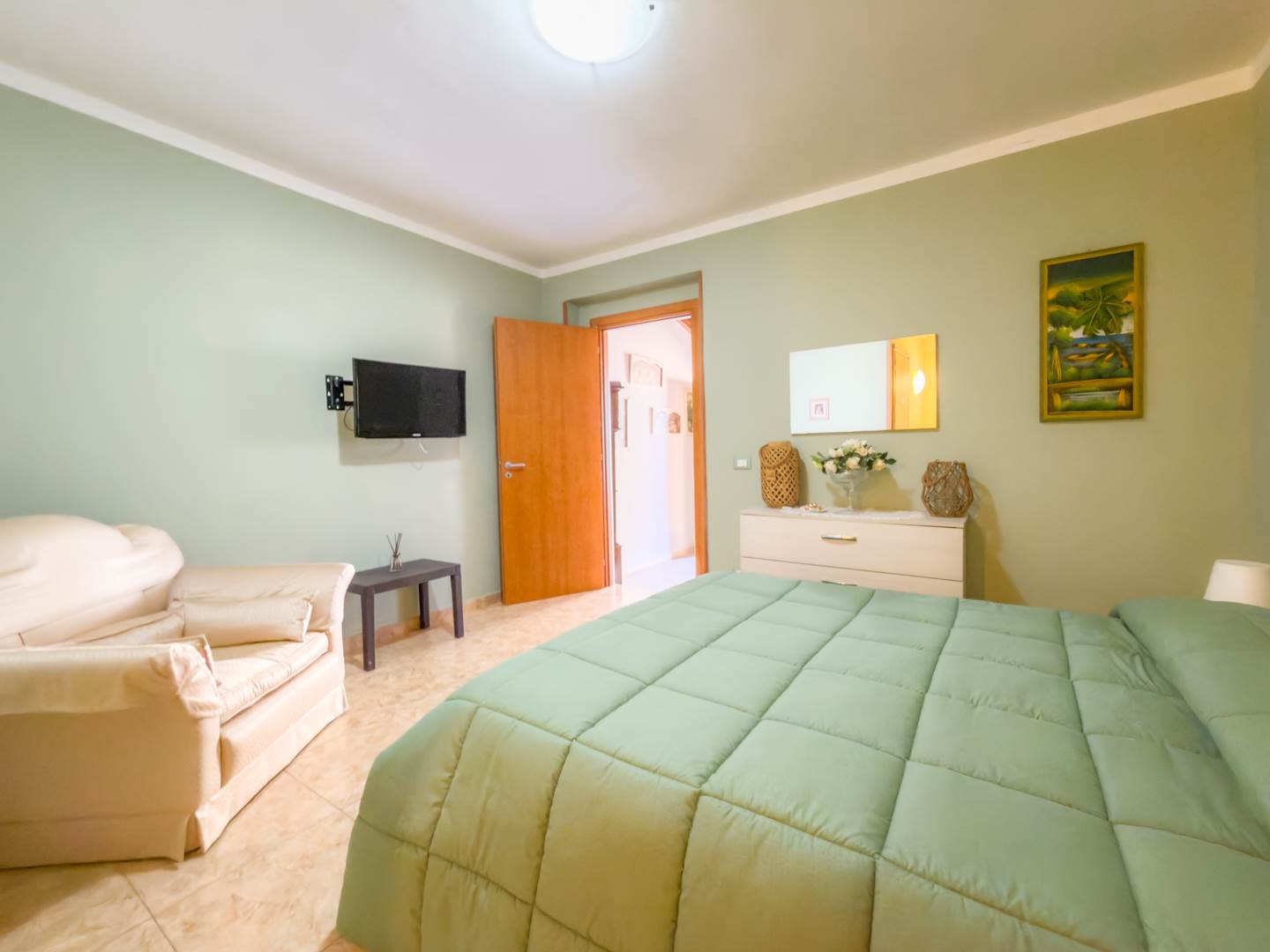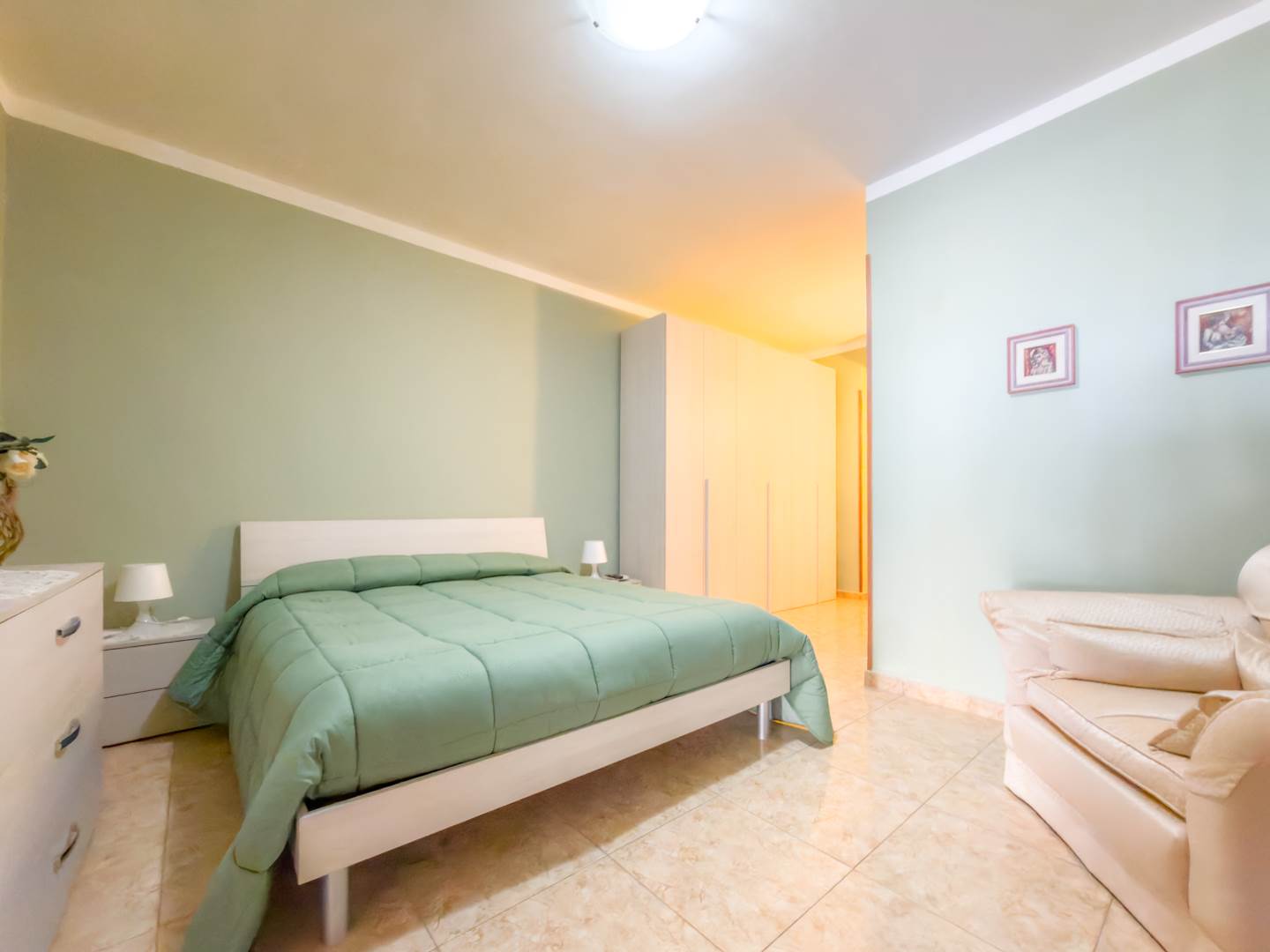 Proseguendo nella zona più riservata della casa, il secondo disimpegno conduce alla seconda camera da letto con bagno en suite dotato di vasca, soluzione che assicura comfort e autonomia. Sul lato opposto si sviluppa la terza camera, anch’essa ampia e regolare nelle dimensioni.